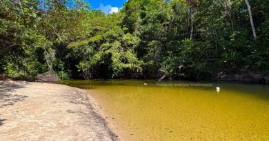Balneário Valentim em Açailandia: lago de águas verde cristalina e fundo de areia clara, cercado por vegetação nativa.