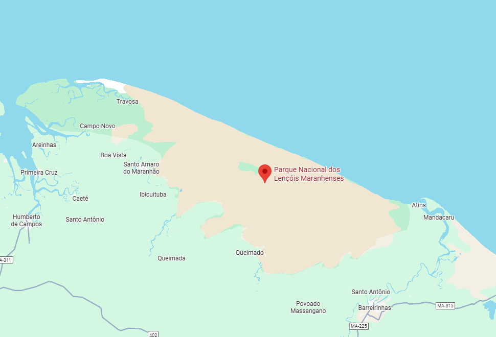 O Parque Nacional dos Lençóis Maranhenses fica a 250km da capital do estado do Maranhão, São Luís.