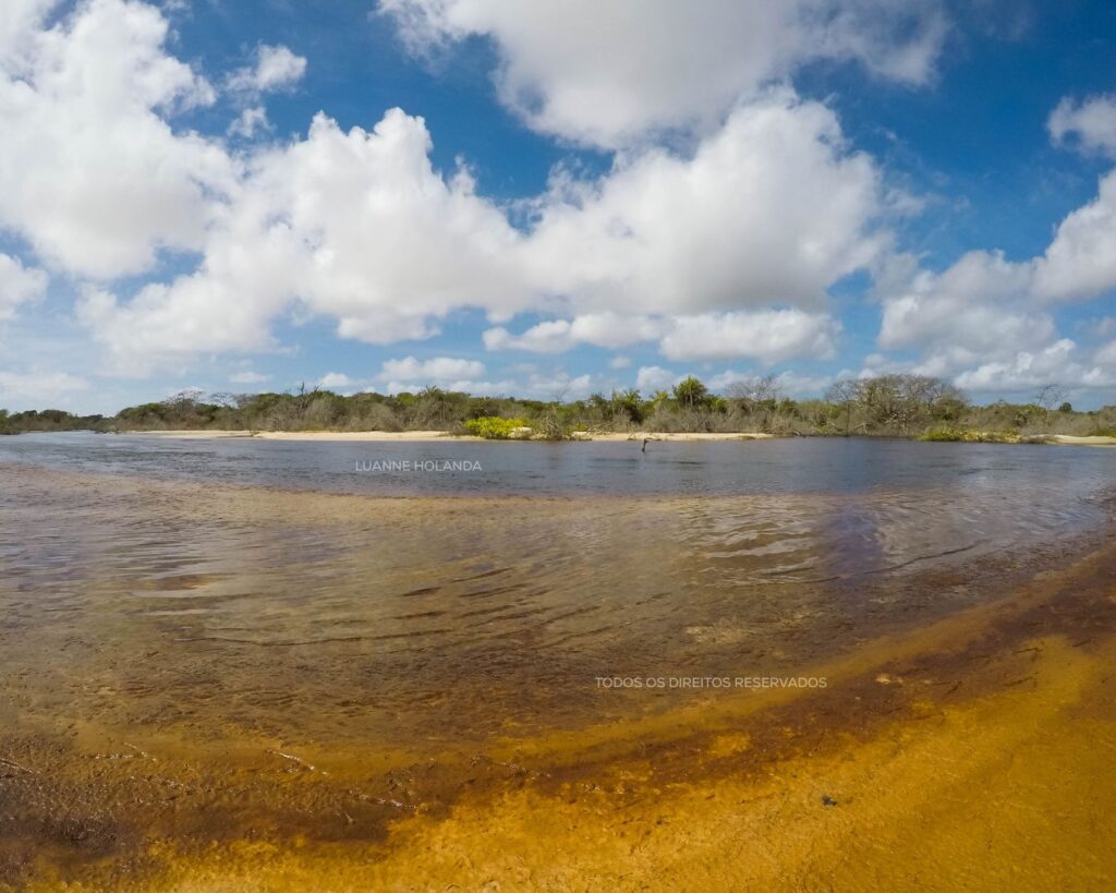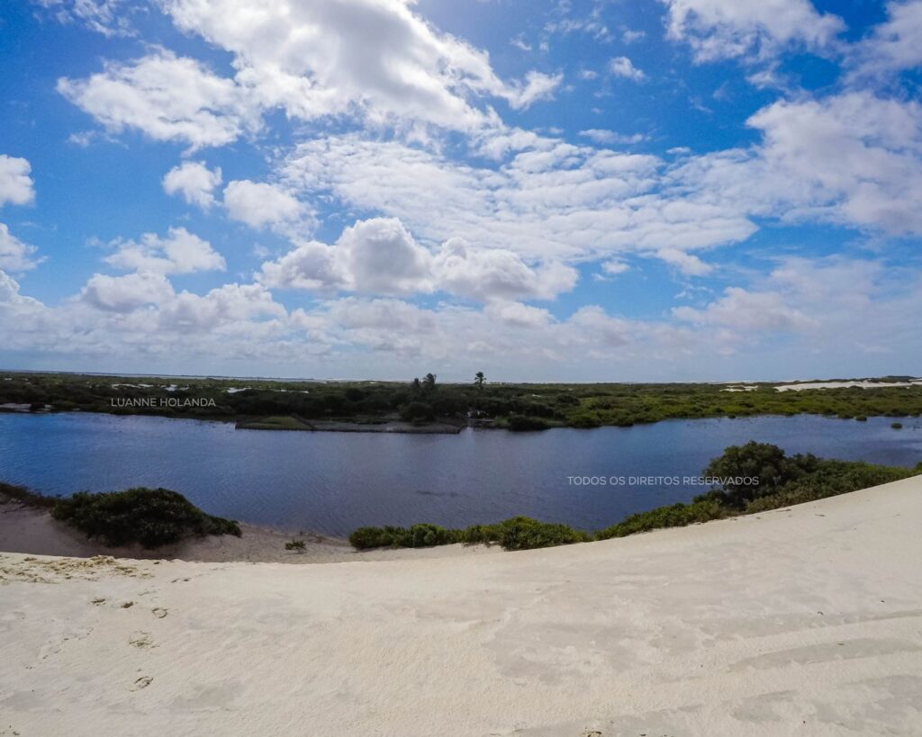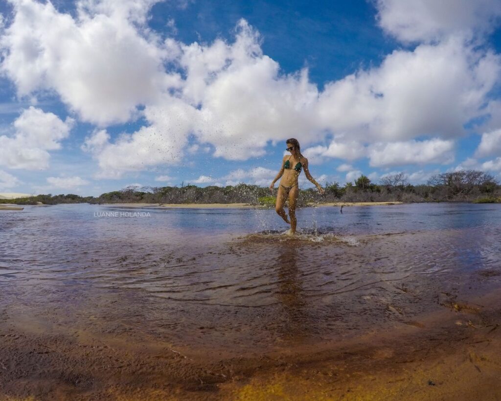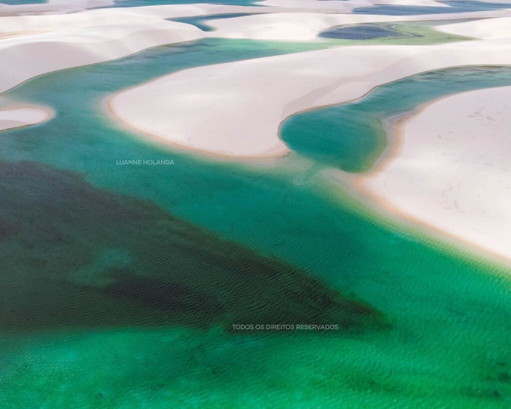 O contraste dos tons das águas encanta! Enquanto nas lagoas do Parque Nacional o azul turquesa e verde esmeralda compõe a paisagem, temos também o Rio Alegre com suas águas escuras, num tom amarronzado contrastando com o branco da areia. Podemos ficar no alto da duna admirando as duas paisagens.